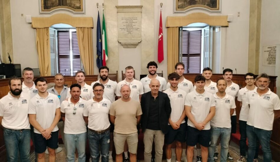 Domenica 21 inizia il campionato, i tradizionali saluti dell’amministrazione comunale General Contractor al completo, compresi i componenti degli staff, per il tradizionale saluto nella sala consiliare del comune di Jesi. Microfono in mano al vice sindaco Samuele Animali, che, per l’occasione ha “rubato”