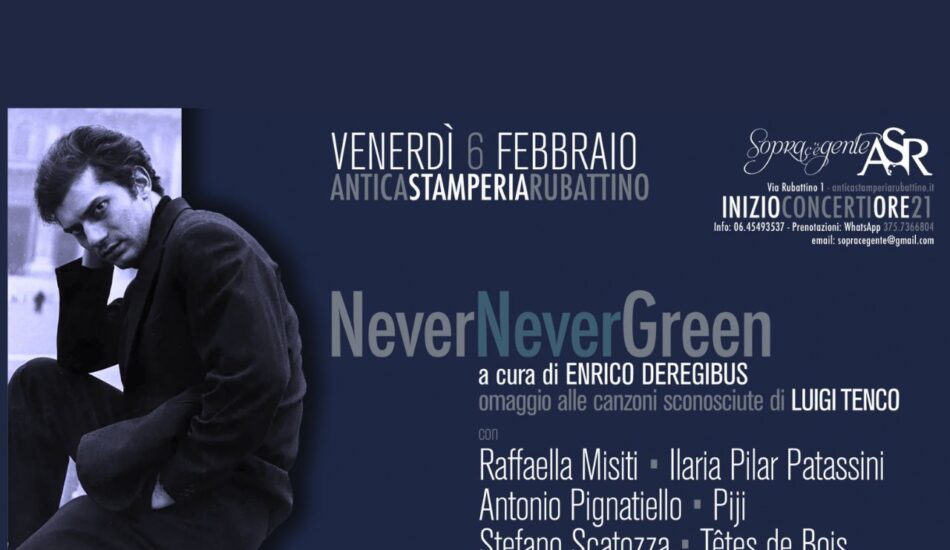 Torna “Nevernevergreen” alla Stamperia Rubattino: Enrico Deregibus guida un viaggio tra canzoni rare, ironia e impegno sociale, lontano dai soliti cliché ROMA – C’è un Luigi Tenco che va oltre l’immagine malinconica e il tragico epilogo sanremese; un artista ironico, sociale e intimo,