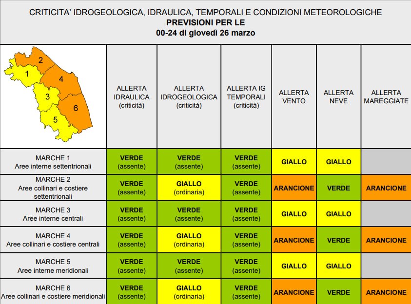 La Protezione Civile della Regione Marche ha emesso il bollettino di allerta meteo valido per la giornata di giovedì 26 marzo che prevede allerta arancione per vento e mareggiate in tutte le aree costiere delle Marche.