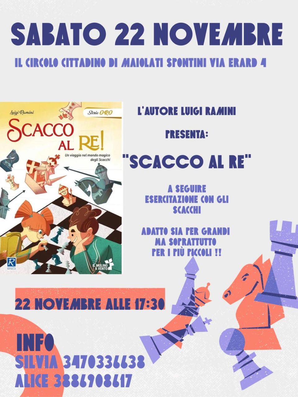 Nuovo appuntamento con il Club Autori Jesini, sabato 22 novembre – ore 17:30 – al Circolo cittadino di Maiolati Spontini; l’autore Luigi Ramini coinvolgerà grandi e giovanissimi nella presentazione del suo libro intitolato “Scacco al Re!” che racconta del meraviglioso gioco degli scacchi, uno dei più antichi al mondo, ma sempre attuale e appassionante. In modo vivace e divertente, attraverso il racconto di una storia, si entra nel vivo di questo gioco che sviluppa capacità logiche e di concentrazione, stimolando intuizione e creatività.