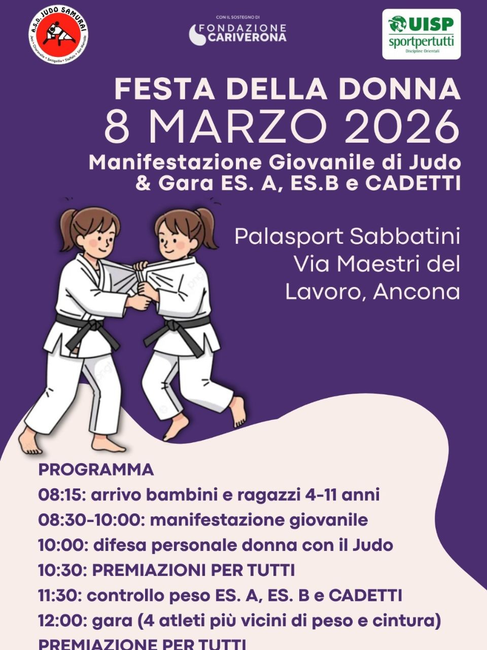 Domenica 8, in occasione della Festa della Donna, al palasport Sabbatini di Ancona – Via Maestri del Lavoro – si terrà una manifestazione giovanile di judo, per Esordienti A, Esordienti B e Cadetti.
